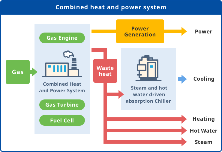 Combined heat and power system is a distributed power generating system which generates electricity on site, where they need electricity. This system makes it possible to reduce energy by using the waste heat from the electricity generation to produce heating, hot water, steam and cooling.