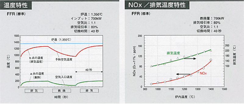 独自のバーナ形状により、燃焼ガスと高温の予熱空気を別々に高速で炉内に噴出させ、周囲の炉の雰囲気ガスを大量に巻き込んで自己排ガス再循環を行いながら、火炎温度を低く抑えて燃焼します。 - 緩慢燃焼