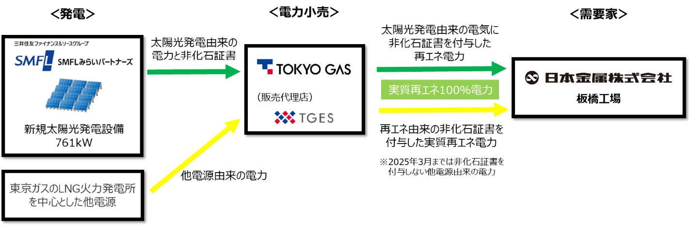 日本金属株式会社(社長:下川 康志、以下「日本金属」)と東京ガス株式会社(社長:笹山 晋一、以下「東京ガス」)、東京ガスエンジニアリングソリューションズ株式会社(社長:小西 康弘、以下「TGES」)、三井住友ファイナンス&リース株式会社(社長:橘 正喜、以下「SMFL」)の戦略子会社であるSMFLみらいパートナーズ株式会社(社長:寺田 達朗、以下「SMFLみらいパートナーズ」)の4社は、このたび、日本金属板橋工場へのオフサイトコーポレート PPA*1スキーム(以下「本スキーム」)を活用した再生可能エネルギー(以下「再エネ」)電力の供給について合意しました。