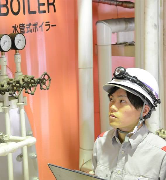 入社して最初に感じたのが、先輩方の面倒見の良さです。7月までは同期の新人と一緒に座学で教わり、その後は一人に一人、教育係の先輩がついてくれます。先輩の作業に同行して、手順や設備の仕組み、内部の設計など丁寧に教えてもらえます。私の教育係は何でも知っていて、トラブルにも一人で迅速に対応できる尊敬できる方。自分も早くそうなって、後輩に慕われる先輩になりたいですね。ボイラー技士2級の国家資格を取得したので、次は1級目指して頑張ります。